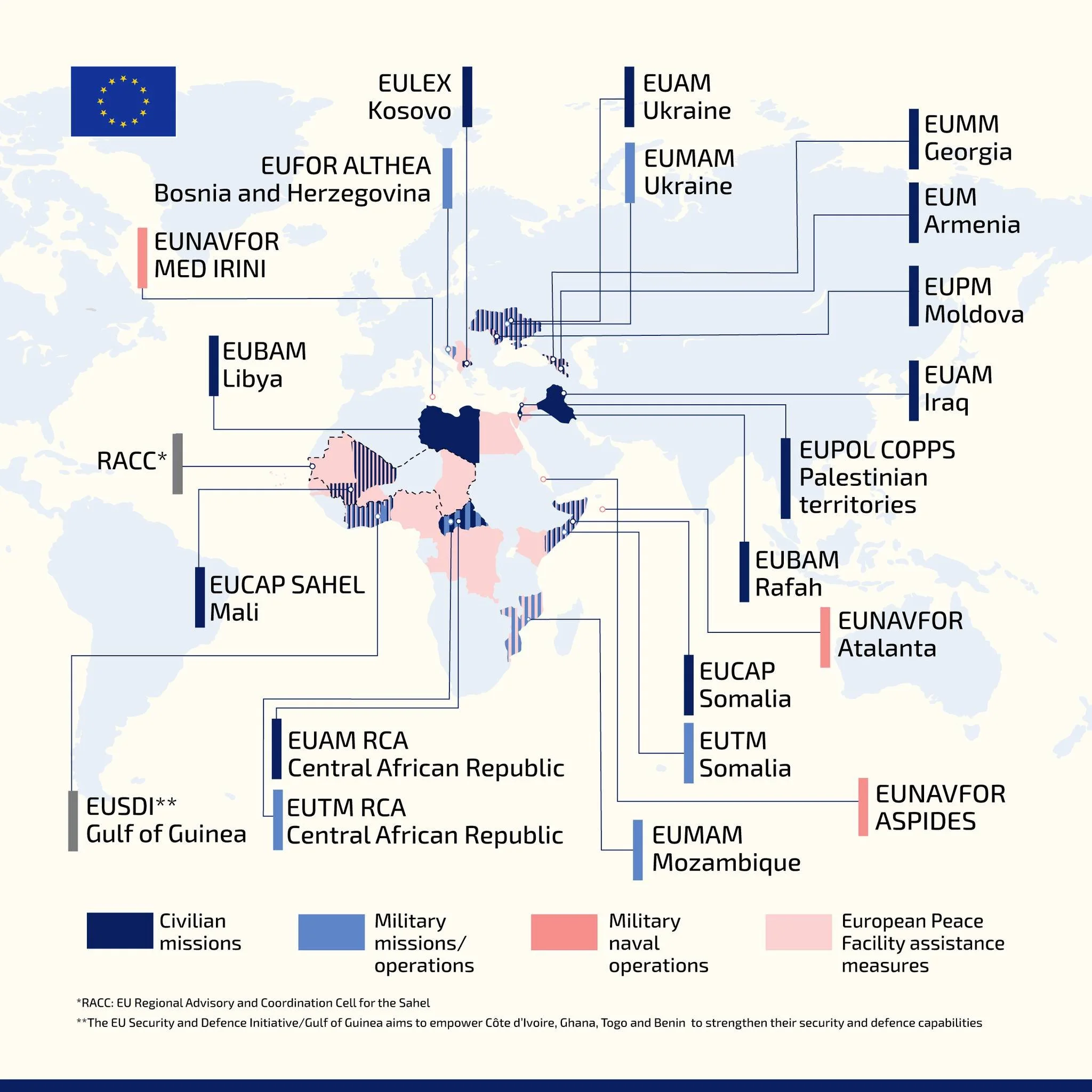 Under the banner of the EEAS and, consequently, the CSDP, the European Union has launched more than 40 overseas operations since 2003 (see Figure 1), of which 21 are currently active in various parts of the world. These operations vary greatly in terms of the type of commitment deployed, their scope, and their mandate. EEAS-led operations can be either civil or military. Examples of civil operations include EUAM Iraq or EUAM Ukraine. In both cases, civilian personnel operate on the ground, supporting security reforms in particularly challenging environments, through processes of policy support and capacity building aimed at reinforcing local political stakeholders. Similar capacity building missions are also conducted in Somalia and Mali (ECA, 2019), where civilian advisors from EU countries support local stakeholders in an effort to reinforce local security capabilities and governmental authority . (Further information on the CSDP military and civilian mission can be found directly on the transparency website, at the following address: Civilian and military missions and operations - Consilium.)